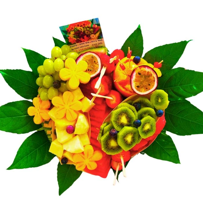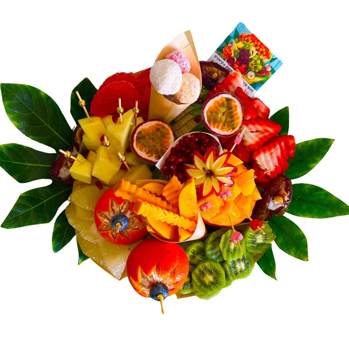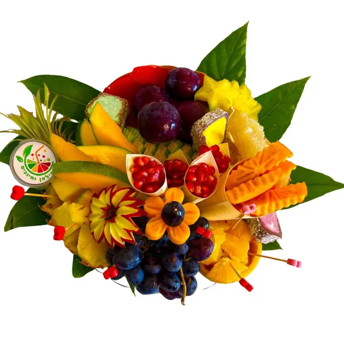מגש פירות בעיצוב מוקפד ומעורר תיאבון, מושלם כפינוק, מתנה או לאירוח מרשים.