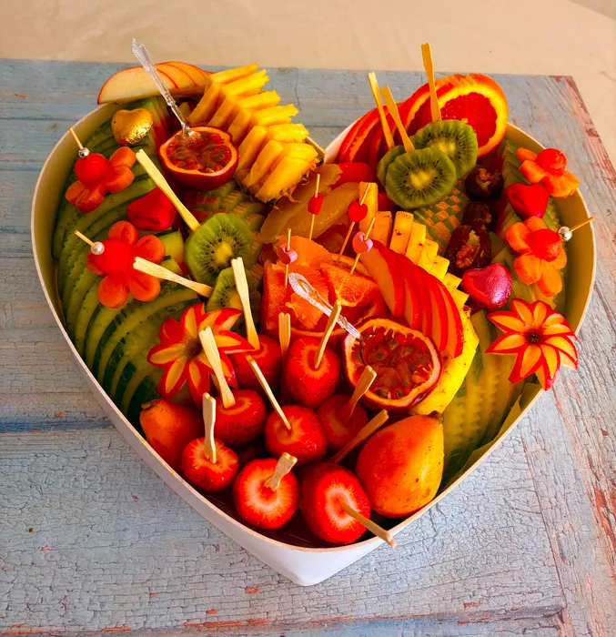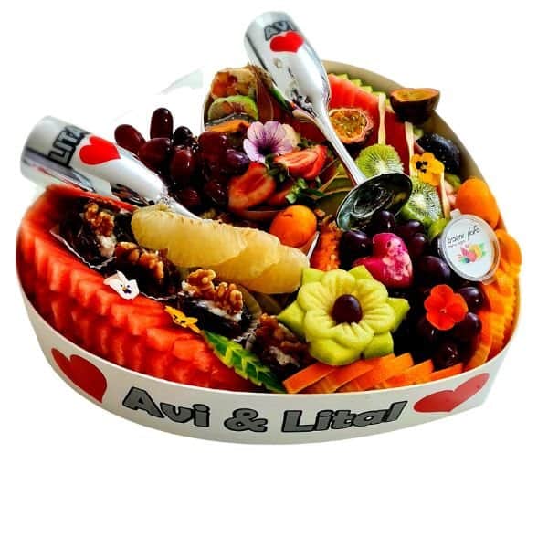 מגש ייחודי בצורת לב, מעוצב במיוחד לאנשים שאוהבים לפנק ולהתרגש.מלא בפירות העונה הטריים, חתוכים ומסודרים באסתטיקה מרשימה.